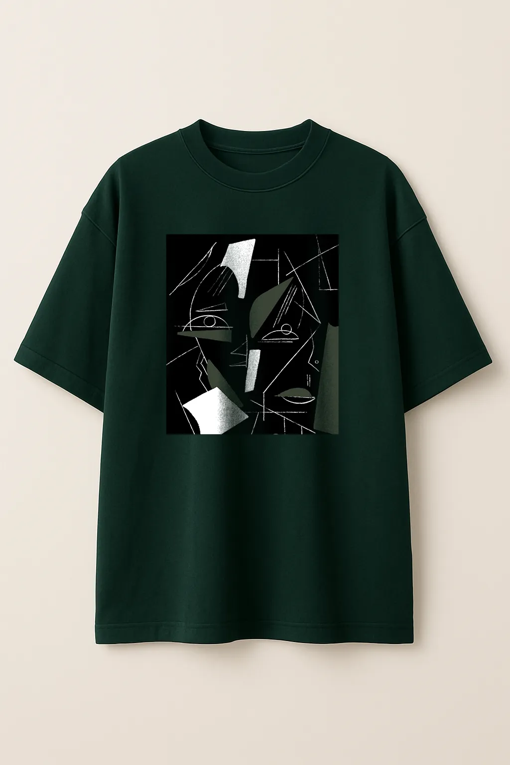 Step into depth with Abstract on rich bottle green — a canvas rooted in mystery. The graphic face design merges street-art energy with minimal luxury on 240 GSM super-soft cotton, for those who don’t just wear style but speak it. Drop shoulders. Unisex fit.