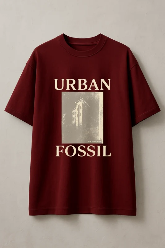 The Urban Fossil oversized tee captures the poetry of urban decay, transforming a distressed monochrome building facade into wearable art. Bold serif “URBAN” above and “FOSSIL” below frame the core visual like a museum curation. Subtle PROFESSOR branding integrates seamlessly into the composition, creating a timeless and sophisticated streetwear piece.