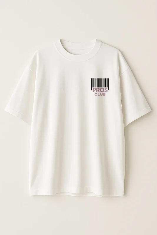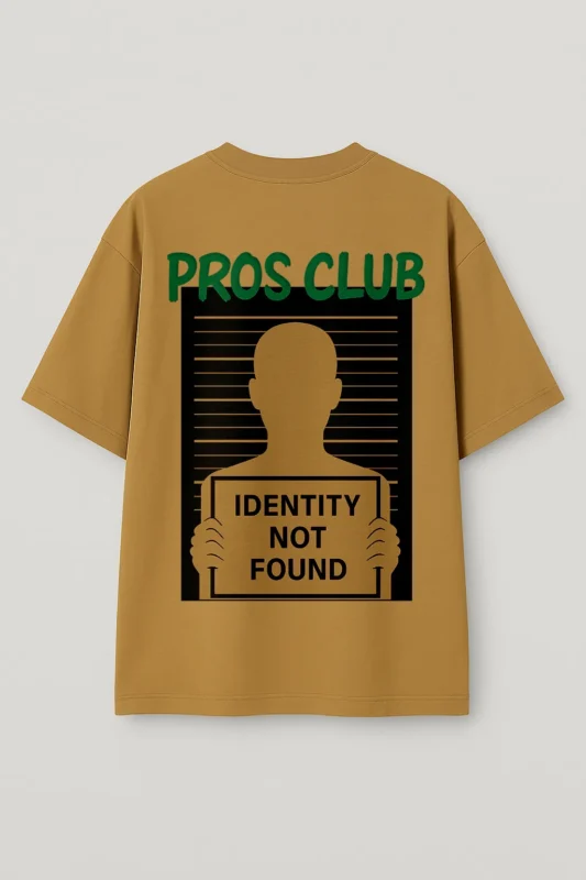 A minimalist front mark meets a bold back statement. The PROS CLUB oversized tee places a compact barcode + “PROS CLUB” on the chest and a large, arresting back graphic — a silhouetted mugshot holding a placard that reads “IDENTITY NOT FOUND.” The design interrogates anonymity, membership, and identity with graphic clarity and street-ready attitude.