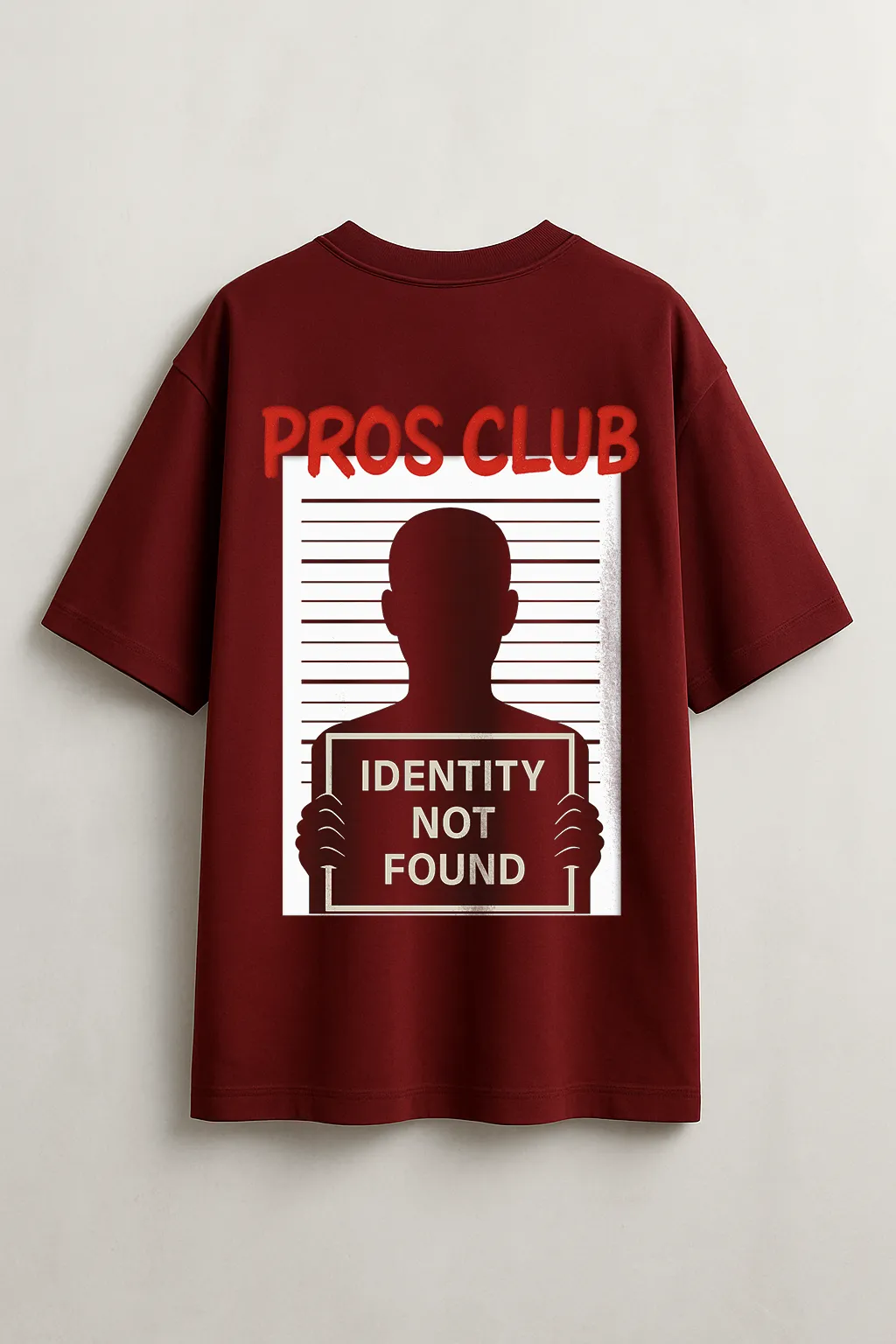 A minimalist front mark meets a bold back statement. The PROS CLUB oversized tee places a compact barcode + “PROS CLUB” on the chest and a large, arresting back graphic — a silhouetted mugshot holding a placard that reads “IDENTITY NOT FOUND.” The design interrogates anonymity, membership, and identity with graphic clarity and street-ready attitude.