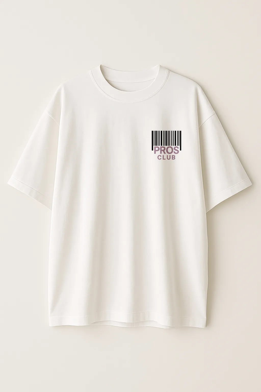 A minimalist front mark meets a bold back statement. The PROS CLUB oversized tee places a compact barcode + “PROS CLUB” on the chest and a large, arresting back graphic — a silhouetted mugshot holding a placard that reads “IDENTITY NOT FOUND.” The design interrogates anonymity, membership, and identity with graphic clarity and street-ready attitude.