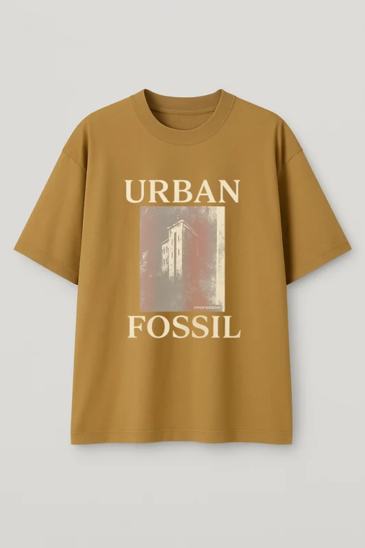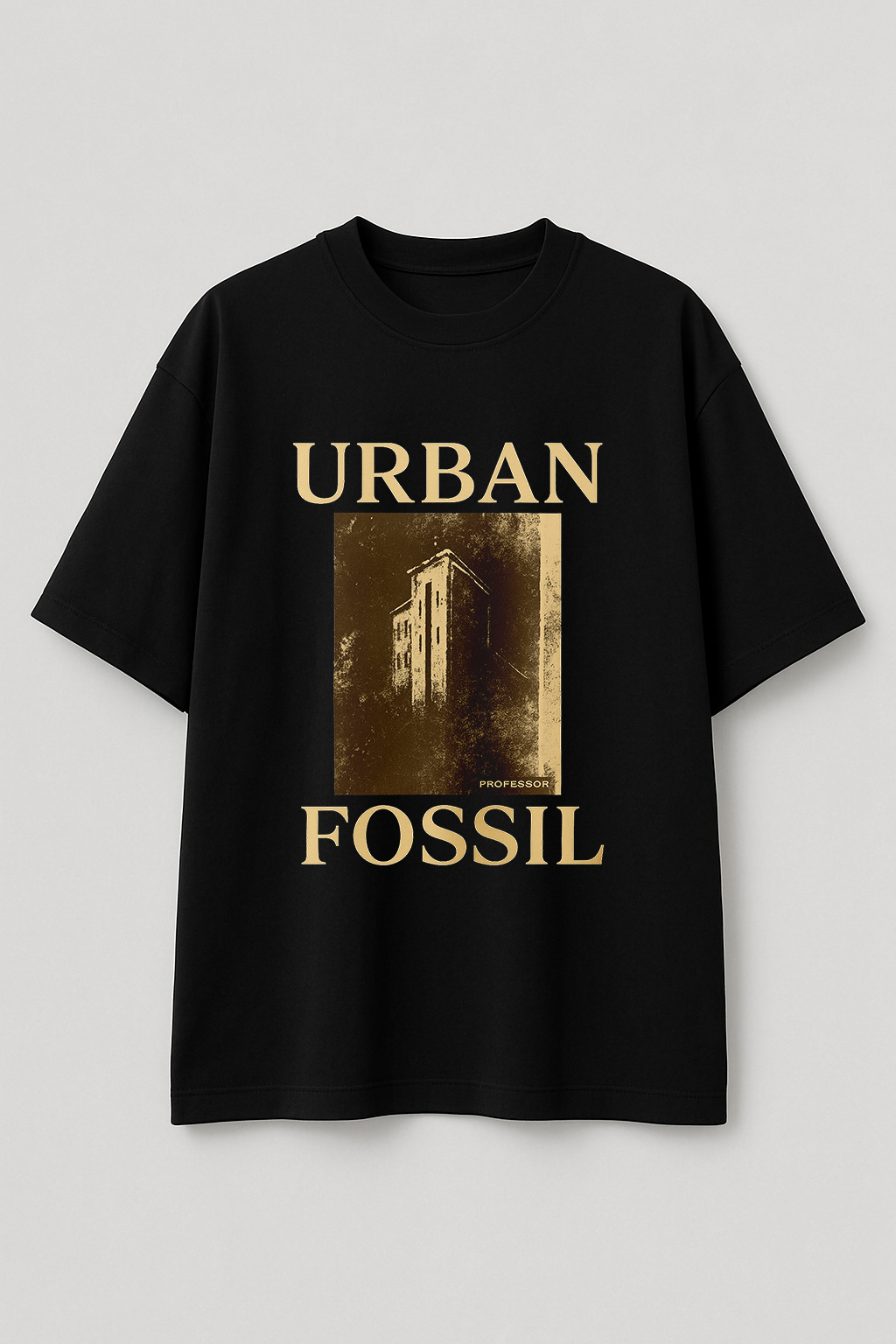 The Urban Fossil oversized tee captures the poetry of urban decay, transforming a distressed monochrome building facade into wearable art. Bold serif “URBAN” above and “FOSSIL” below frame the core visual like a museum curation. Subtle PROFESSOR branding integrates seamlessly into the composition, creating a timeless and sophisticated streetwear piece.