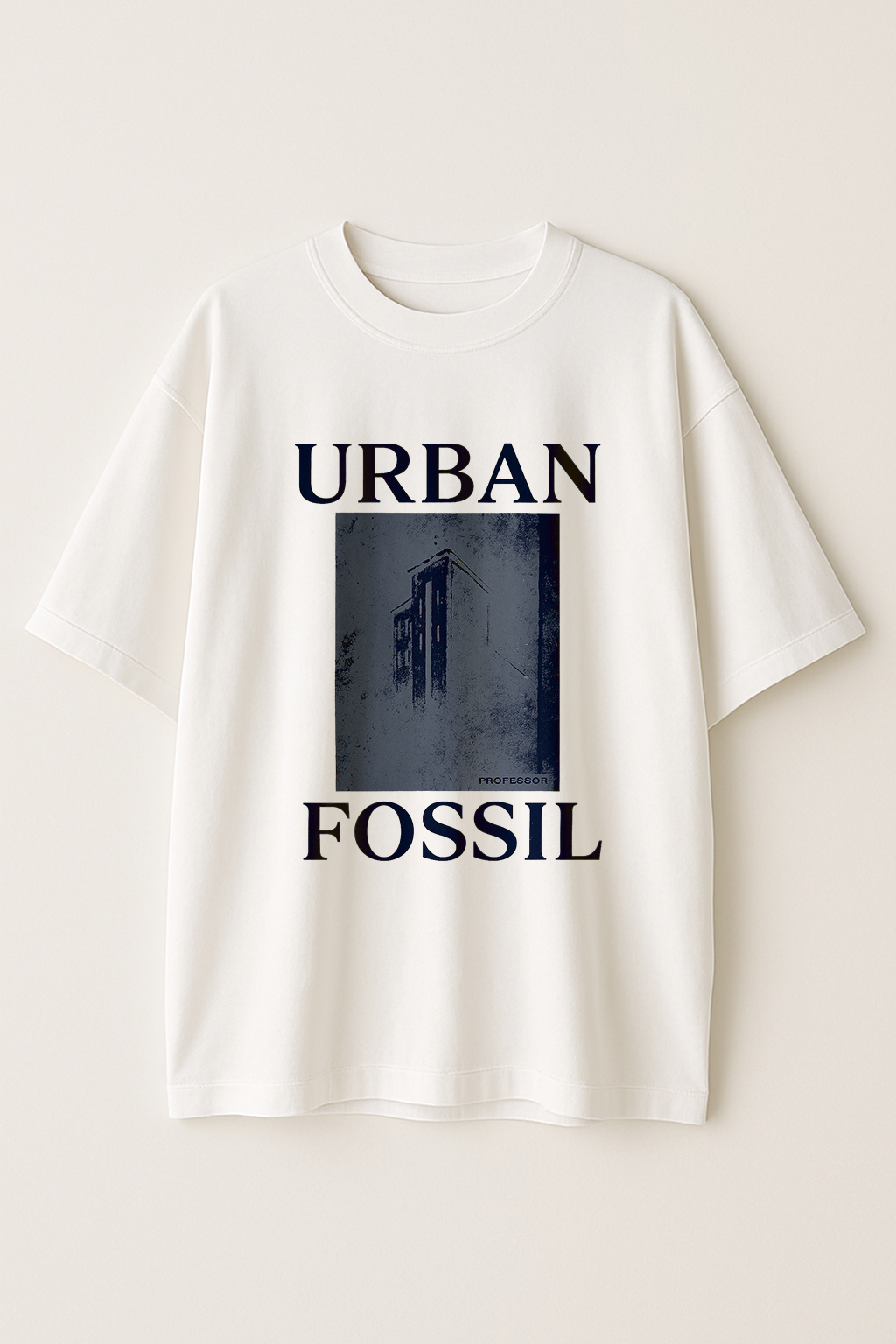 The Urban Fossil oversized tee captures the poetry of urban decay, transforming a distressed monochrome building facade into wearable art. Bold serif “URBAN” above and “FOSSIL” below frame the core visual like a museum curation. Subtle PROFESSOR branding integrates seamlessly into the composition, creating a timeless and sophisticated streetwear piece.